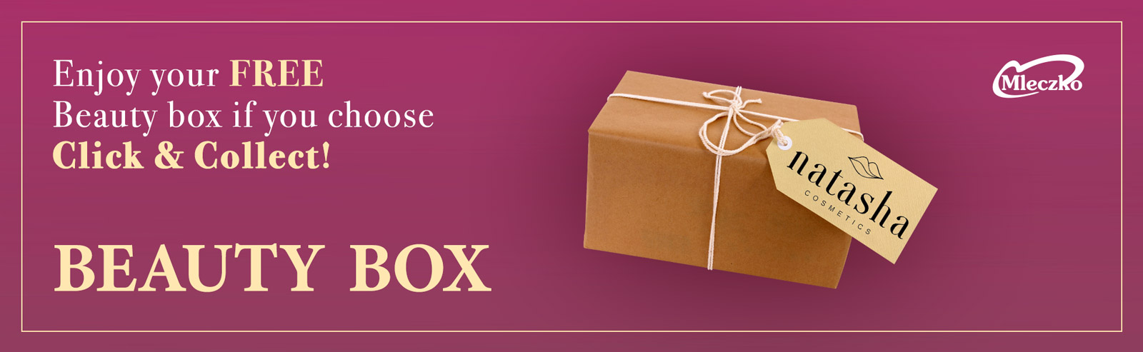 To get your FREE Beauty Box simply spend £20 or more online and select „Click & Collect" at checkout! Pick up for FREE from any of our Mlecko Locations and receive your FREE Beauty Box! Treat yourself to a beauty box!